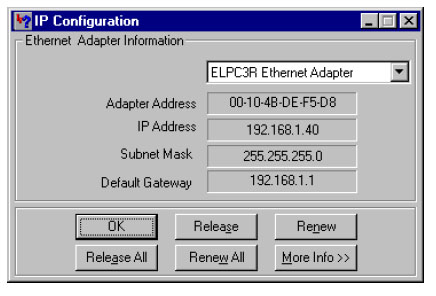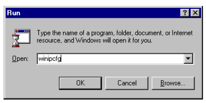o Windows 98 и ME Для запуска winipcfg, выберите Run в меню Пуск и наберите winipcfg в окне Open. Нажмите ОК. Появится окно с IP информацией.