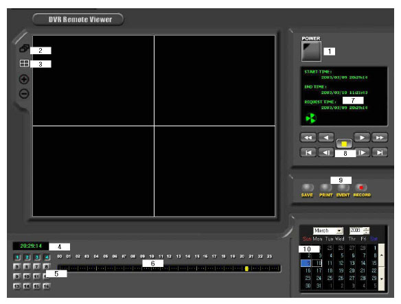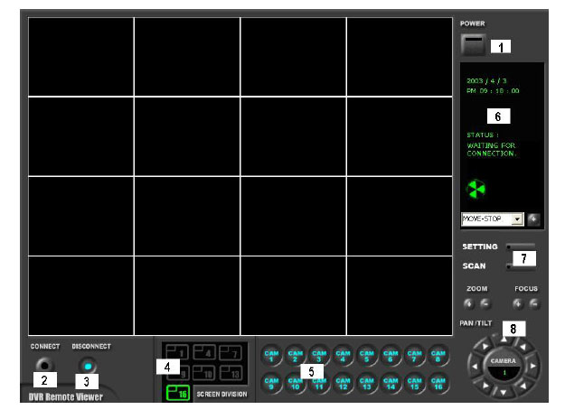 [2]: Кнопка Connect. Нажмите кнопку для подключения к регистратору через сеть IP. Вы увидите ту же картинку, что и на мониторе регистратора, только с некоторой задержкой, которая зависит от скорости передачи по сети IP.