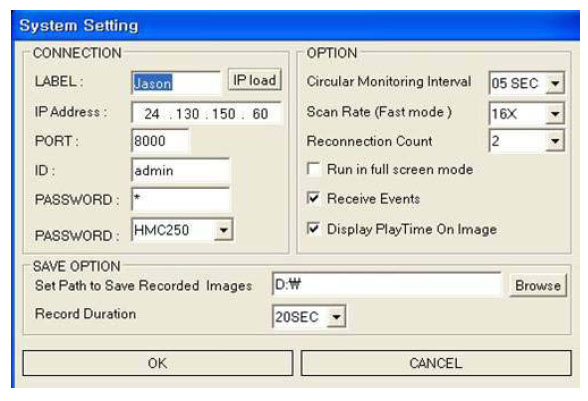 Если подключение осуществлено и появилось сообщение ОК, это означает, что регистратор успешно подключился к сети. Далее, войдите в меню настроек/Настройки TCPIP/Адрес IP (SYSTEM SETUP/TCPIP SETUP/IP ADDRESS). Вы увидите, что регистратор уже получил IP адрес автоматически, от DHCP сервера, через модем, IP Sharer или через ADSL модем. Запишите IP адрес и номер порта и введите их в программу удаленного доступа, установленную на клиентском ПК. Номер порта в регистраторе устанавливается автоматичкски 8000. Если сеть защищена программой firewall, и этот порт защищен firewall, измените номер порта на другой, не защищенный firewall.